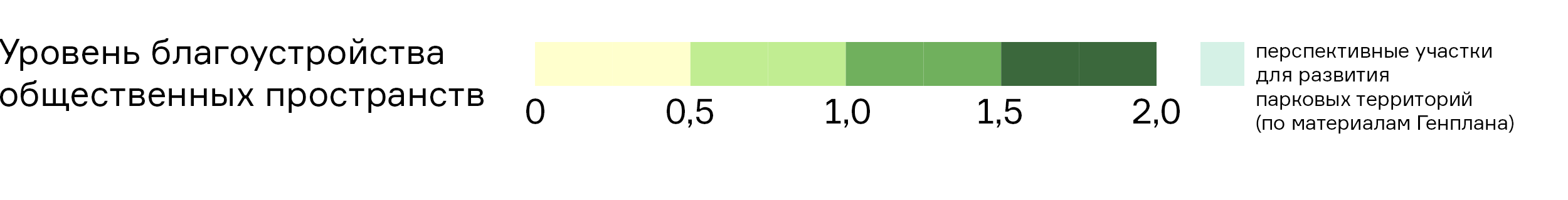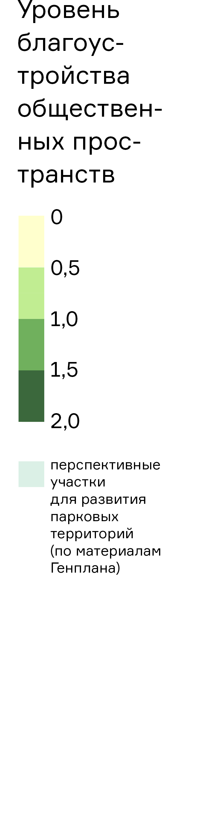 Благоустроенные общественные пространства сконцентрированы в центре города. Общественные пространства в жилых районах, развиты слабо. Большинство из них нуждается в базовом благоустройстве, чтобы полноценно выполнять свои основные функции.