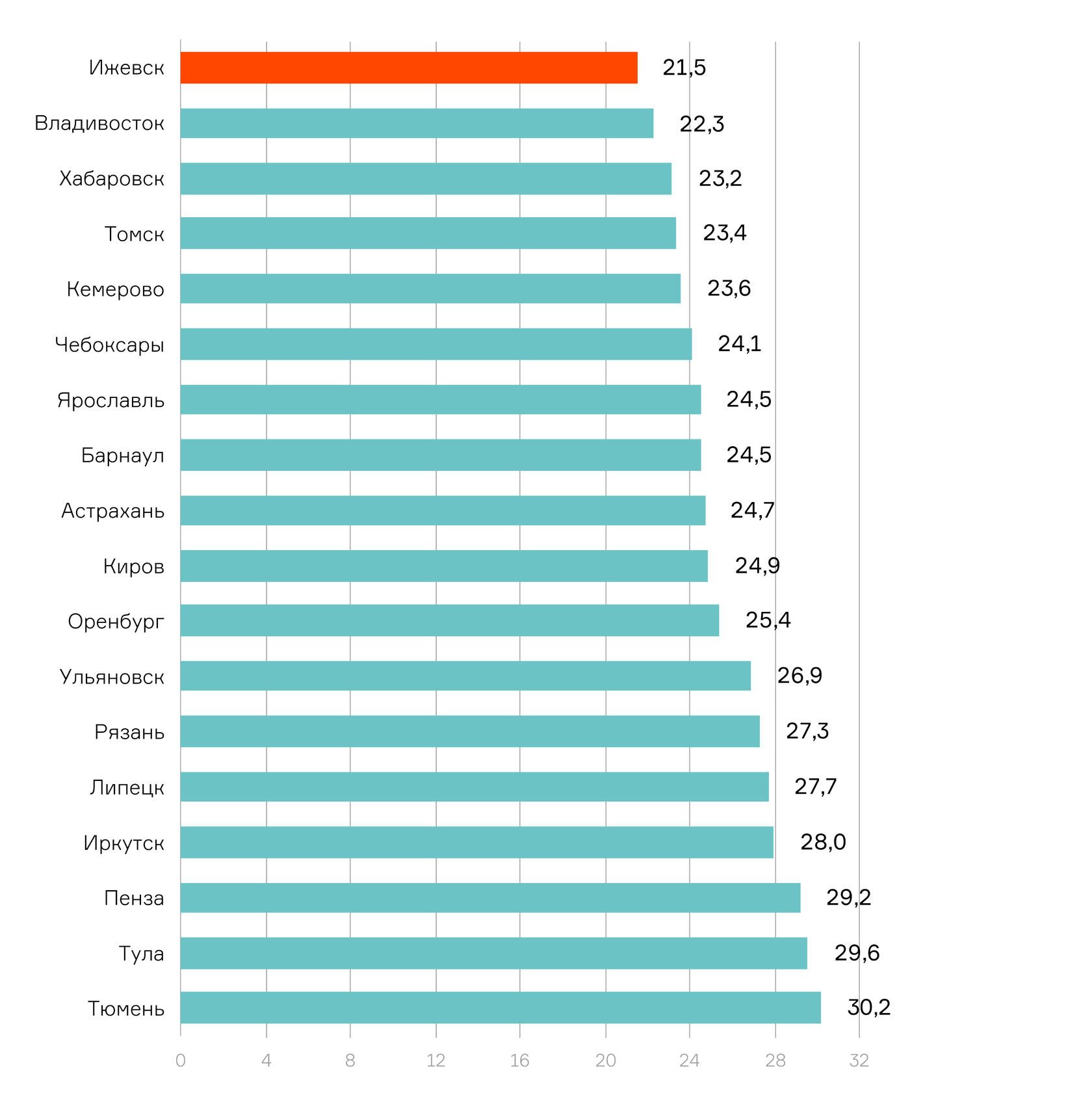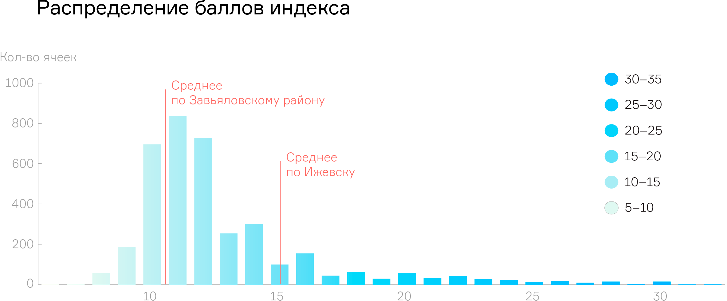 Индекс инфраструктурной обеспеченности — это аналитический инструмент, оценивающий расположение, достаточность и удобство городской инфраструктуры для жителей Ижевска и Завьяловского района. Индекс позволяет одновременно выявить проблемные территории, требующие внимания, и определить приоритетные площадки развития, оценив, какие вложения потребуются для создания комфортной для жизни среды.