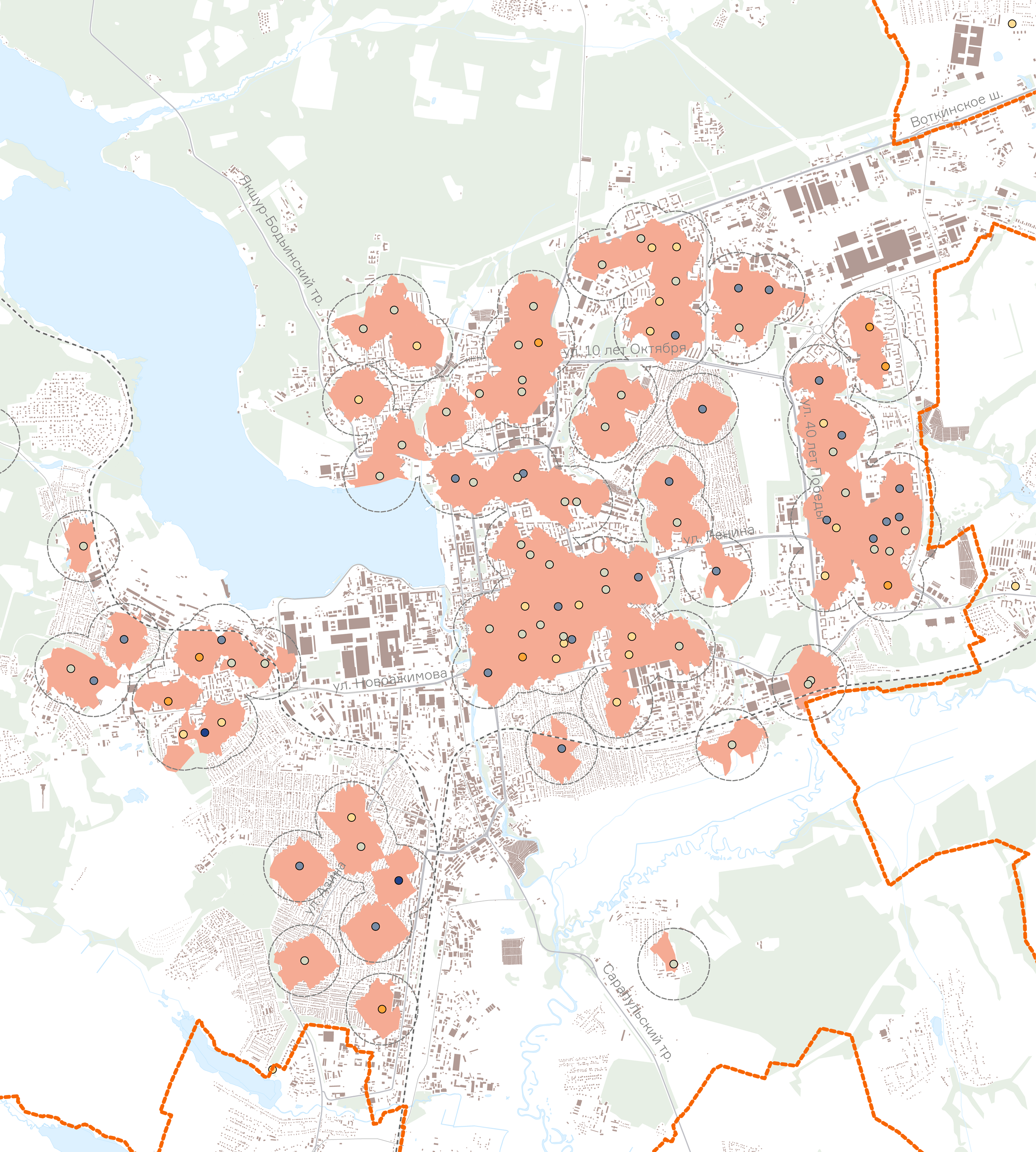 Для поликлиник, спортивных объектов, коммерческой инфраструктуры и общественных пространств оценивается количество объектов, попавших в зону пешеходной доступности на расстоянии 1000 м от центра ячейки.