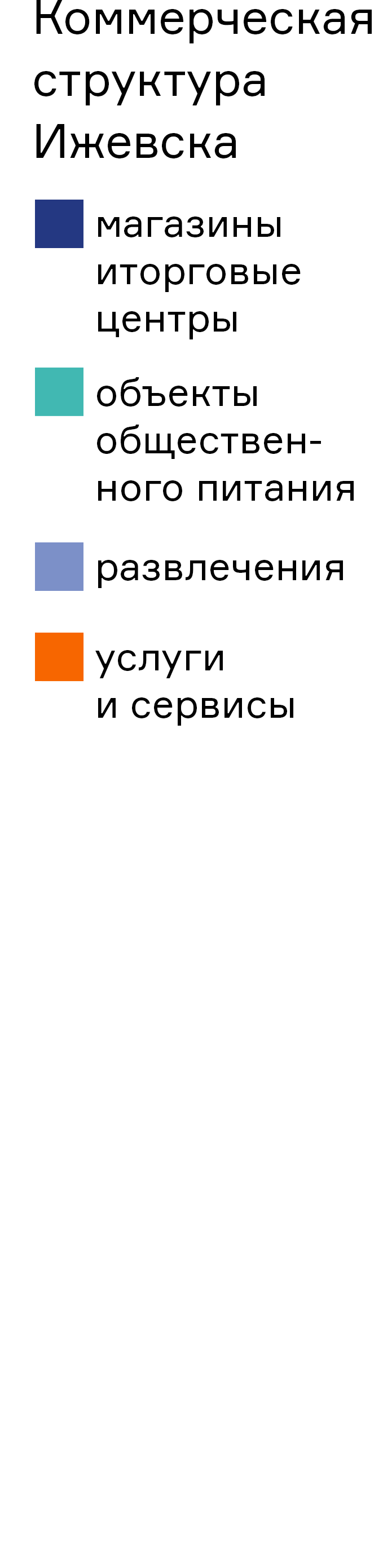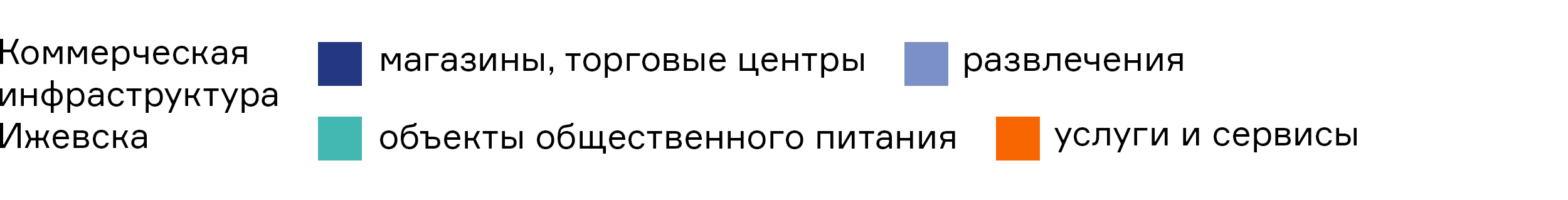 Коммерческая инфраструктура на территории Ижевска и Завьяловского района отличается низким разнообразием: 55% объектов составляют магазины. 20% (или 613 объектов) — это рестораны и кафе, 15% — кинотеатры, клубы, театры, библиотеки и другие объекты досуга, 10% от всех объектов — различные виды услуг: салоны красоты, ремонтные, агентства недвижимости и пр.