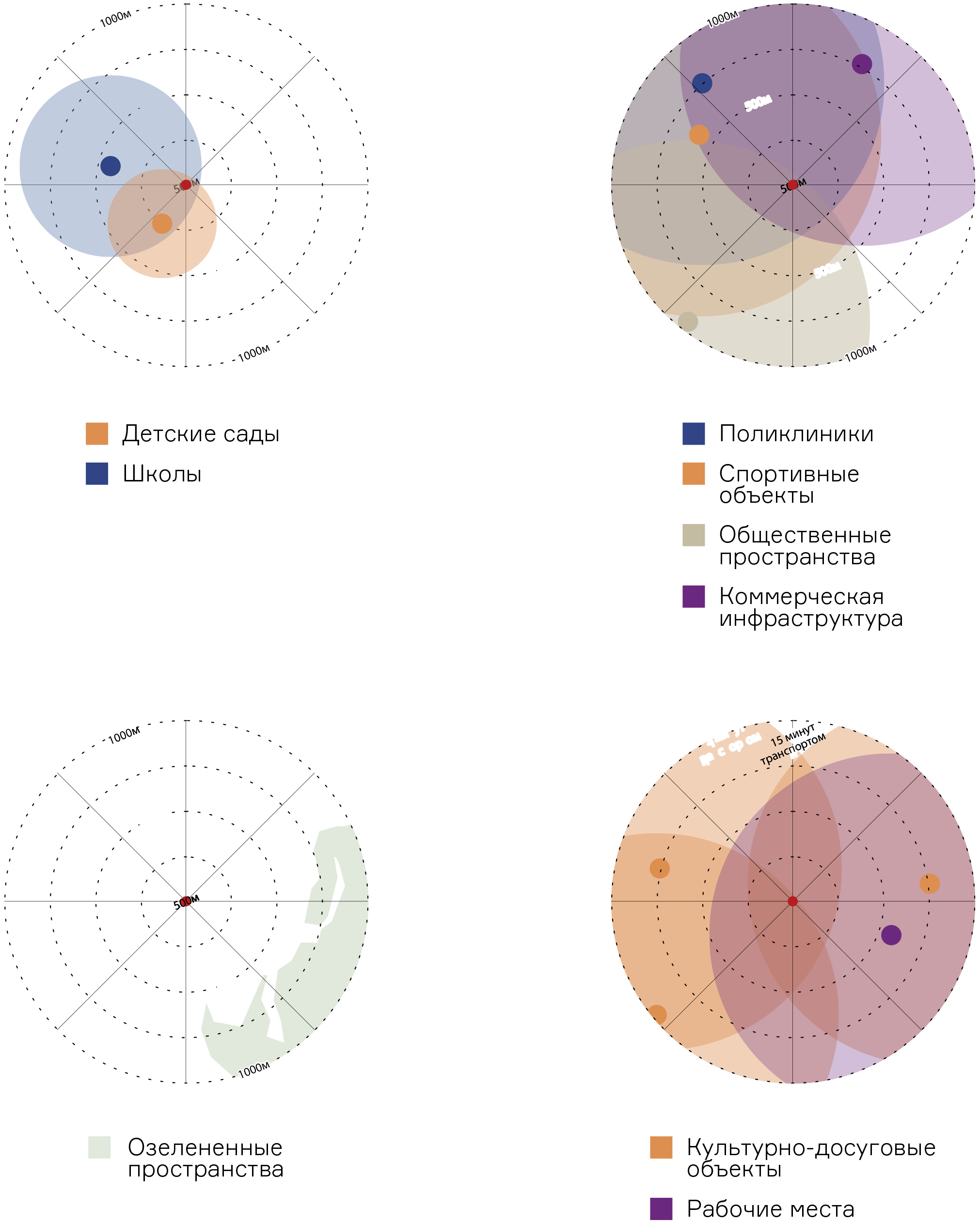 Это интерактивный аналитический инструмент, оценивающий расположение, достаточность и удобство для жителя следующих видов городской инфраструктуры: социальной, культурно-досуговой, коммерческой, рекреационной инфраструктуры и рабочих мест.