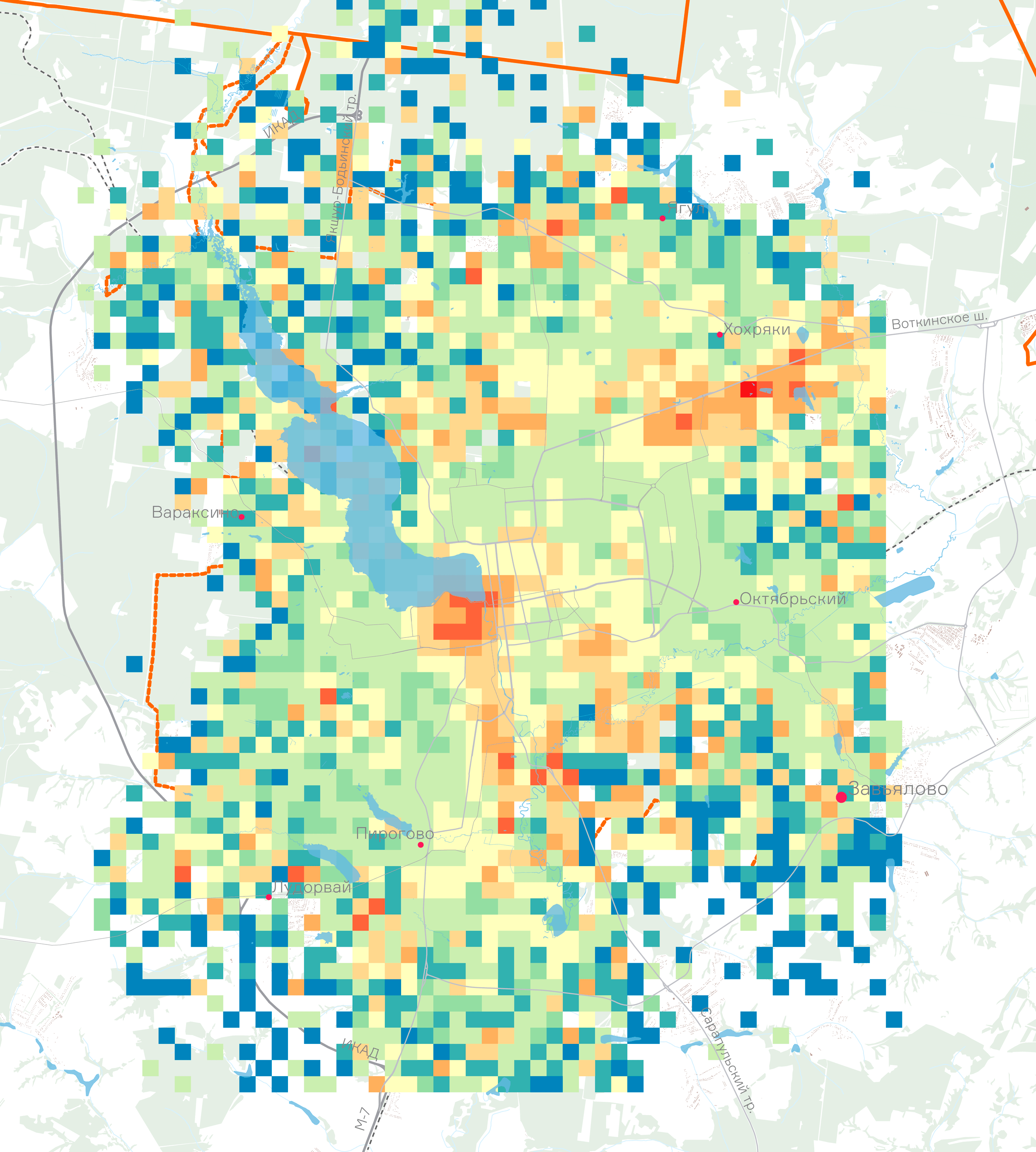На основе анализа данных мобильных операторов о местах концентрации абонентов в рабочее время можно сделать вывод, что большая часть жителей Ижевска работает в центре, а также на территориях обширных промышленных зон города: в центральном, северо-восточном, южном промышленных районах.